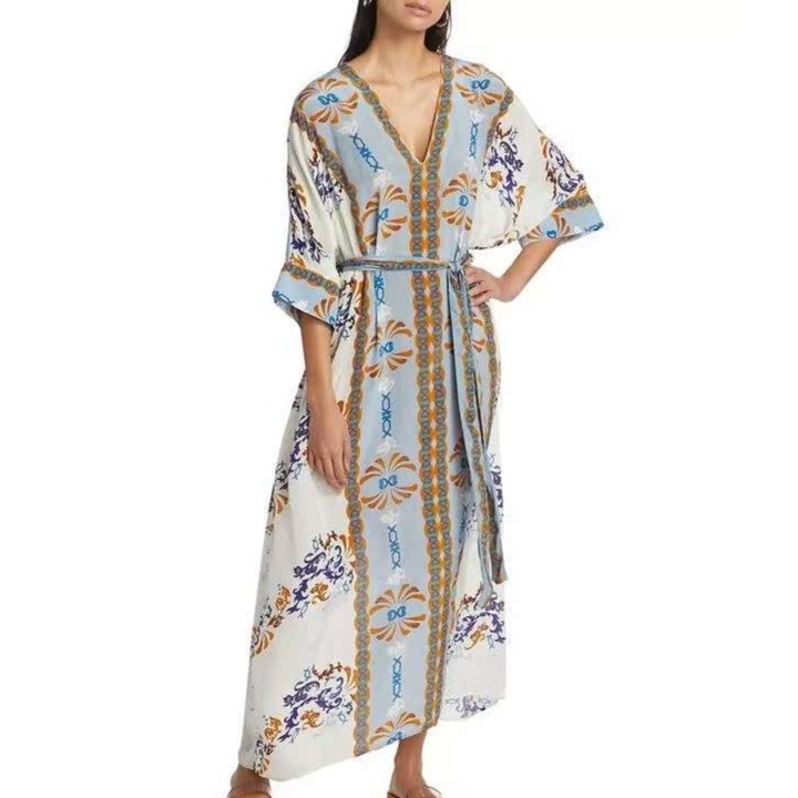 リゾート風プリントの袖たっぷりカシュクールチュニック