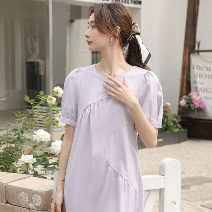 上品なラベンダーカラーが印象的なチュニックドレス。