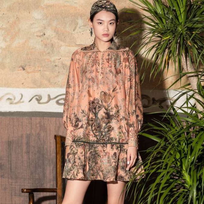 鮮やかなグリーンをベースにした華やかな花柄チュニックです。