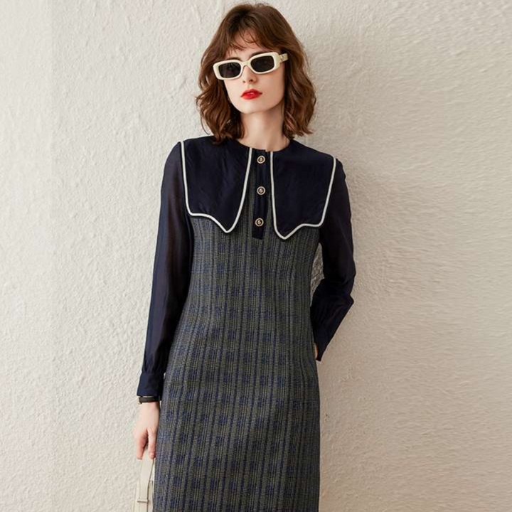 大きな白い襟のコントラストが顔周りを明るく見せ、縦のラインを強調したデザインがスタイルアップ効果を発揮します。