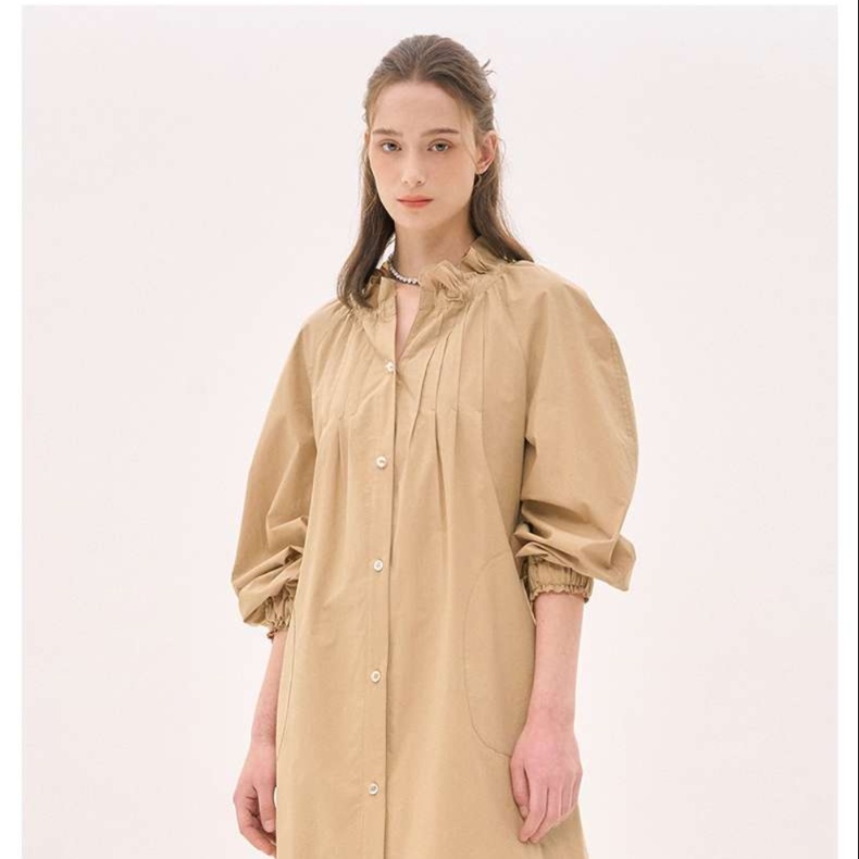 胸元のギャザーデザインが女性らしい立体感を生み出し、全体のシルエットを美しく見せてくれます。