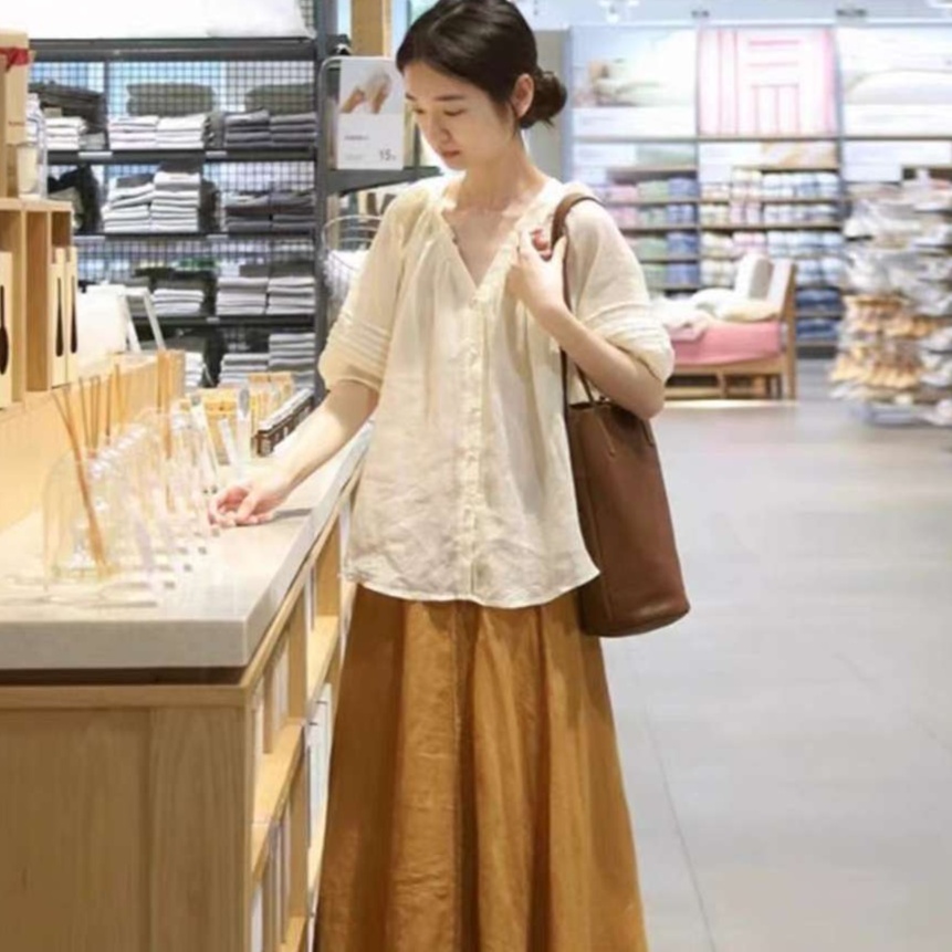 胸元のVネックが顔まわりをすっきりと見せ、ゆったりとしたシルエットが体型カバーもしてくれる嬉しい一着です。