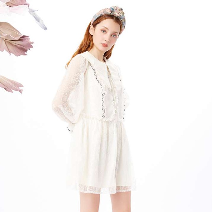 ふんわりとした優しい印象の白いチュニックは、胸元の繊細なレース装飾が魅力的です。