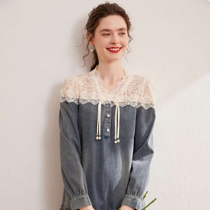 グレーのデニム調コットン生地に、襟元の繊細なレースがエレガントな印象を添えるチュニックです。