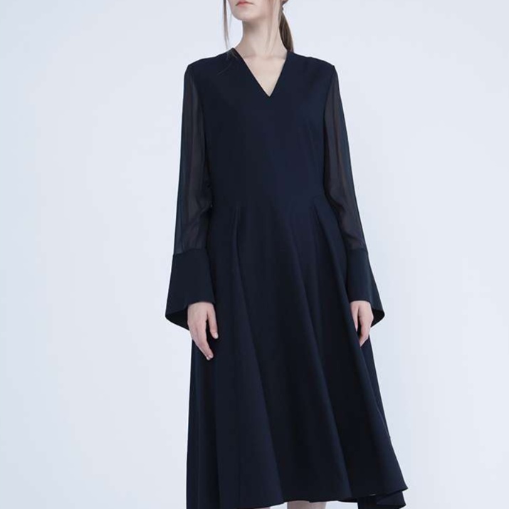 キーネックラインが首元を優雅に見せ、プリーツの動きが歩くたびに美しく揺れる仕様です。