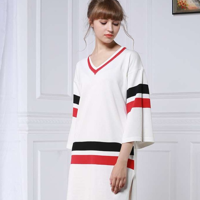 ホワイトベースに赤と黒の配色ラインが効いたスポーツテイストのスリット入りチュニックです。