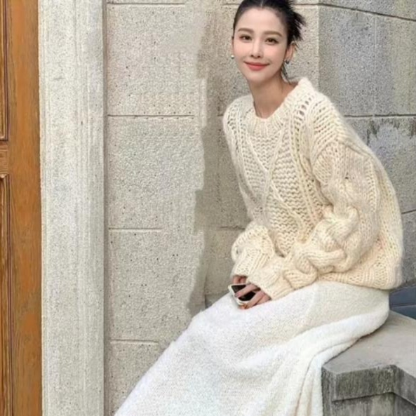 ケーブル編みの表情豊かなデザインが、シンプルなスカートコーディネートのアクセントになります。
