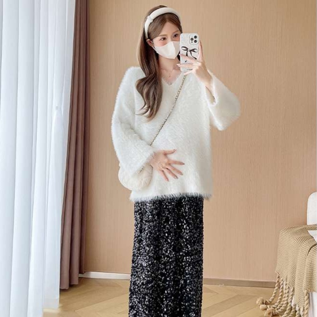 スカートとの組み合わせで優しい雰囲気を演出するふわもこチュニックニット