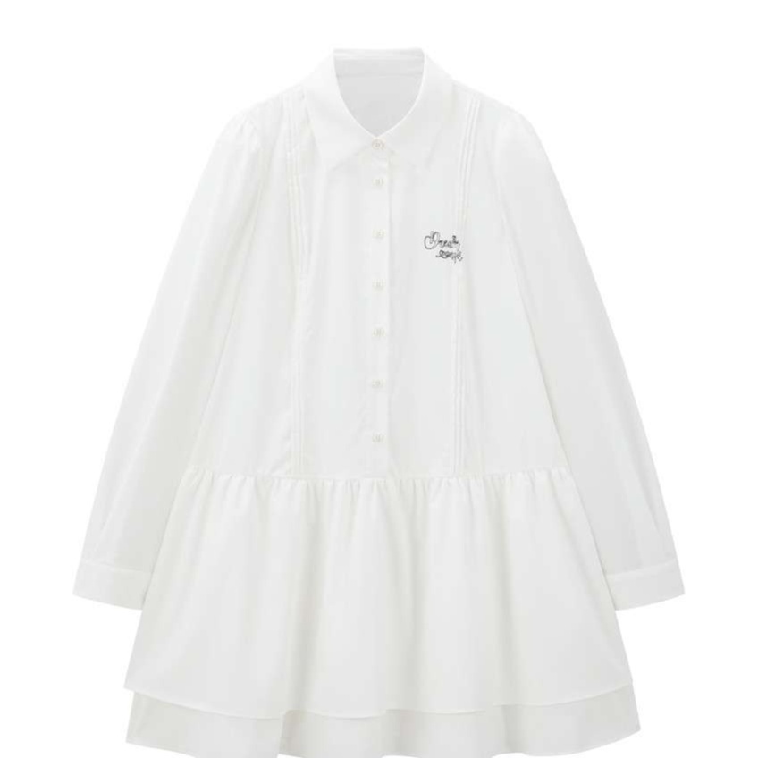 清潔感のあるシャツ襟とフリルの切替デザインが魅力のチュニックブラウスです。