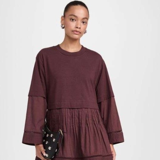 袖のふんわりとしたシルエットが、腕周りを華奢に見せる効果も。