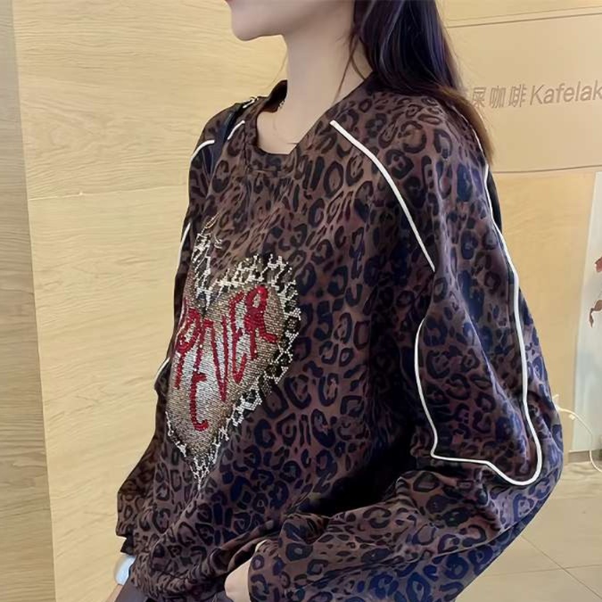 個性的なヒョウ柄にスパンコールのハートモチーフが映える長袖チュニックです。