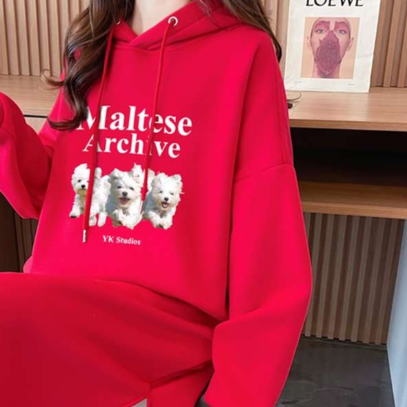 鮮やかな赤色がアイキャッチなフード付きチュニックは、キュートなマルチーズのプリントでさらに魅力的に。