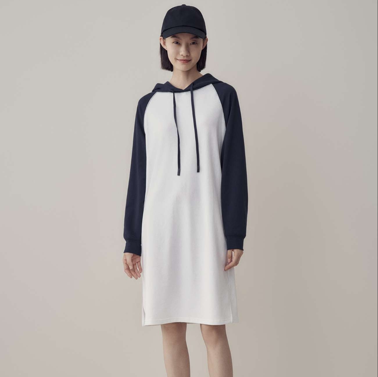 フードとドローコードがカジュアル感をアップさせつつも、シンプルなカラーリングで大人の女性らしさも演出します。