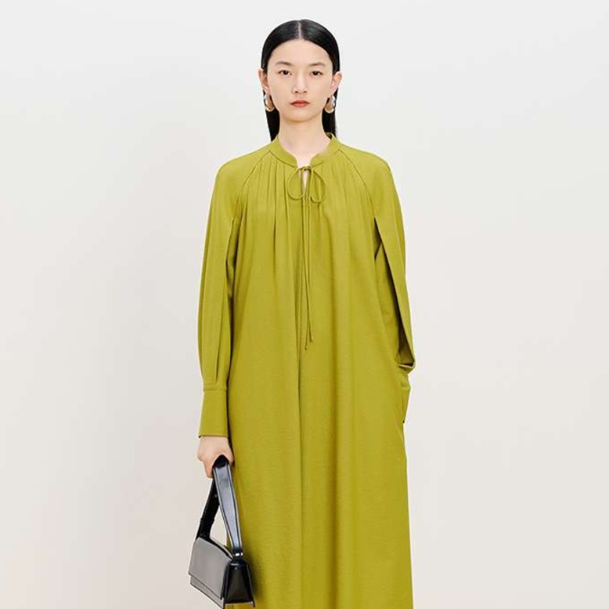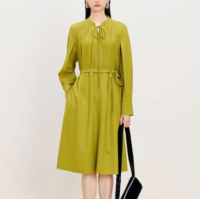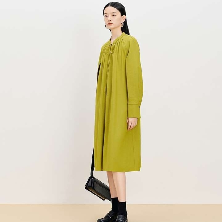 上品な雰囲気を醸し出すゆったりシルエットのチュニックワンピース。特徴的な襟元のかぎ結びやプリーツデザインが魅力的。ウエストベルトで体型にフィットさせることで、洗練された大人のスタイルを楽しめる。シンプルさの中に洗練されたエレガンスを感じさせる一着。普段使いから特別な日まで幅広く活躍するアイテムです。