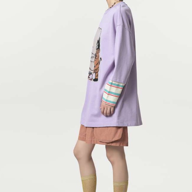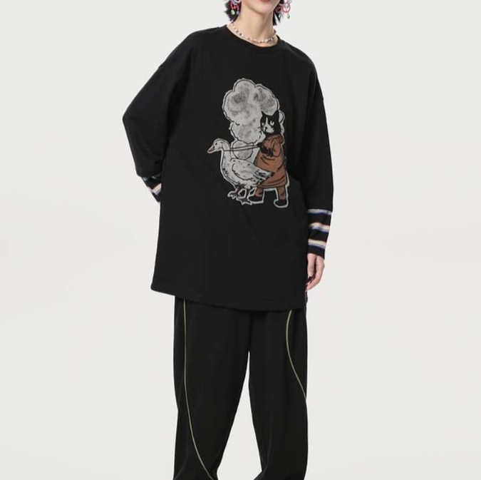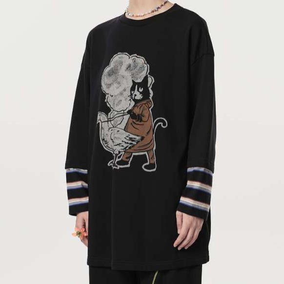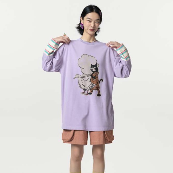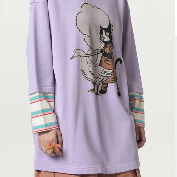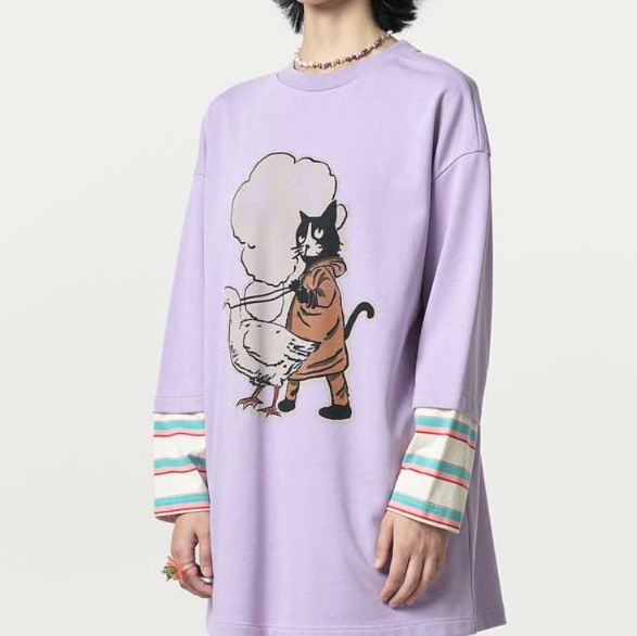 可愛い恐竜と猫の印象的なイラストが特徴的なゆったりチュニック。