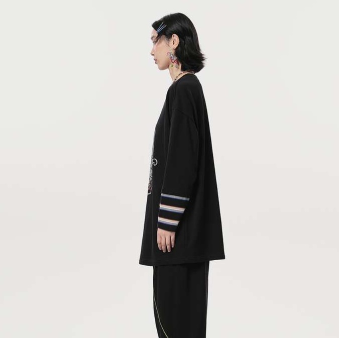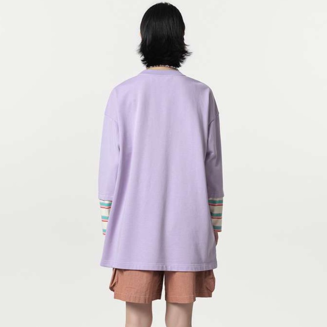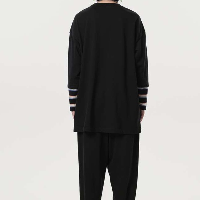 袖口のマルチボーダー切り替えがアクセントとなり、着心地の良いスウェット素材を使用。