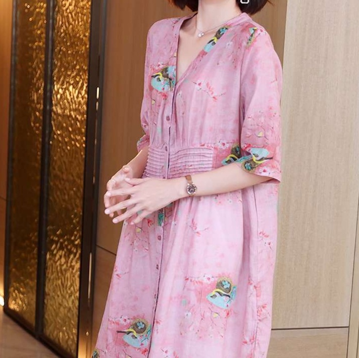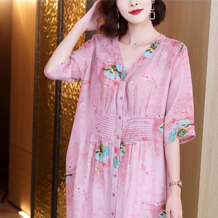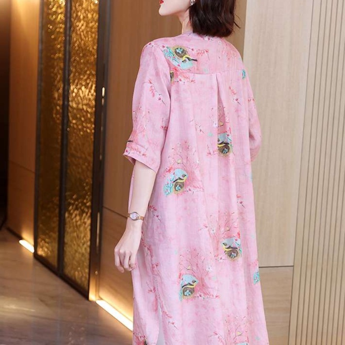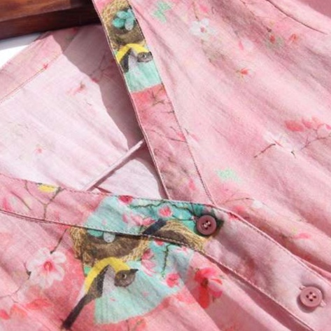 淡い色調の花柄プリントが全体に散りばめられ、優美で女性らしい印象を演出