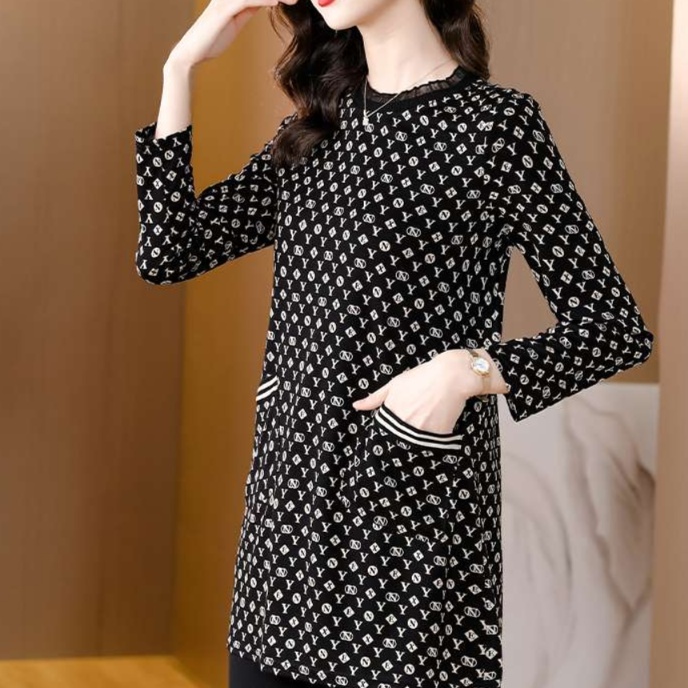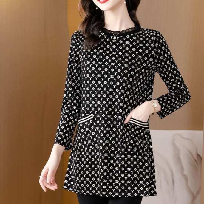 襟元に施されたレースが、エレガントな雰囲気を醸し出すチュニック丈ワンピース。伝統的な小紋柄を現代的にアレンジし、裾と袖口のラインが程よいスポーティ感を加えます。上品さとカジュアルさを兼ね備えたこの一着は、様々なシーンで活躍すること間違いなし。シンプルなアクセサリーを合わせれば、さらに洗練された印象に。
