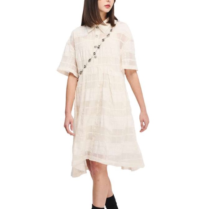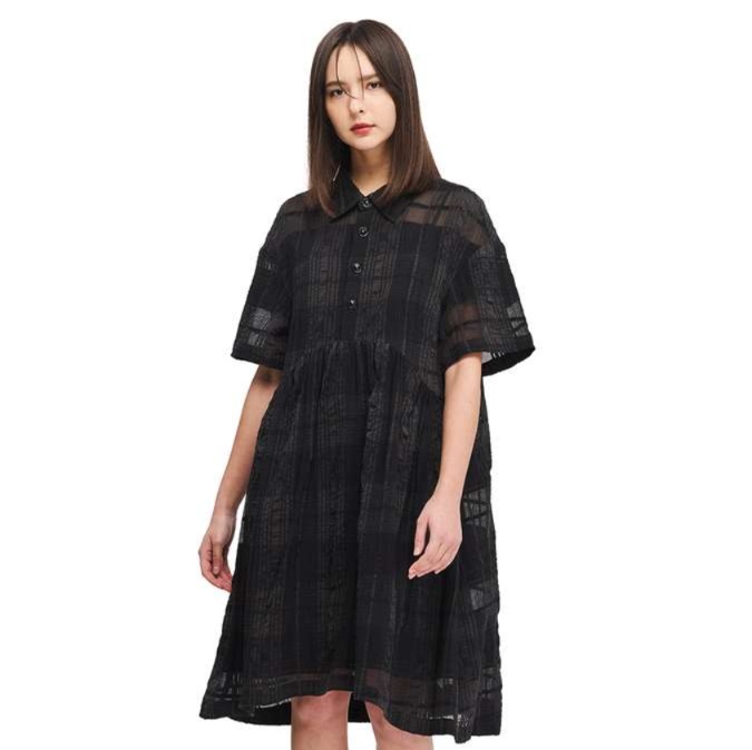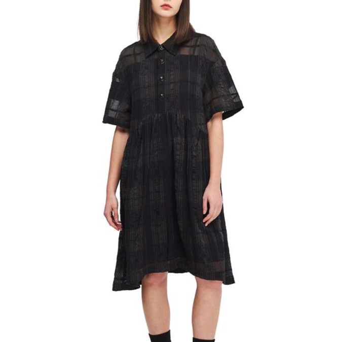 柔らかなチェック柄生地を使用した、リラックス感溢れるチュニックワンピース。裾に向かって優雅に広がるシルエットが特徴で、襟元のボタンと斜めのデザインが洗練された印象を与えます。黒の靴下と靴を合わせることで、シンプルながらスタイリッシュなコーディネートが完成。日常使いにも特別な日にもぴったりな一着です。