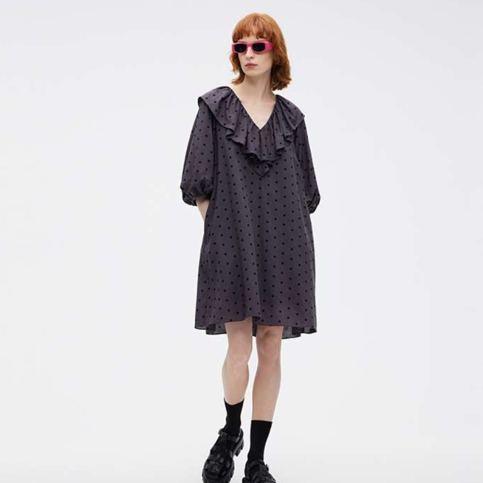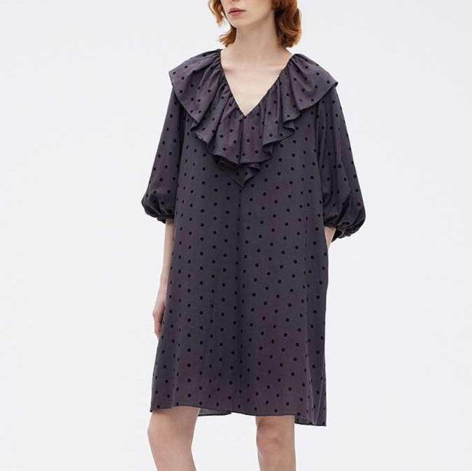 ボリューミーな袖と愛らしいフリルデザインが魅力のチュニックワンピース。胸元のフリルが女性らしさを引き立て、ゆったりとしたシルエットが心地よさを提供。カジュアルな日常使いからお出かけスタイルまで、さまざまなシーンで活躍する一着。シンプルながらも個性を演出し、魅力的なコーディネートを楽しめるアイテム。