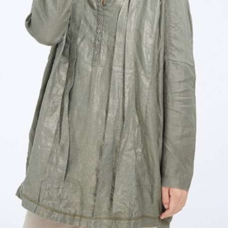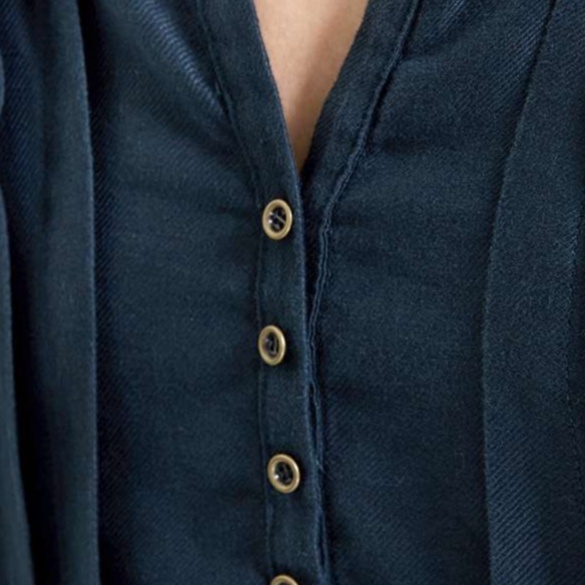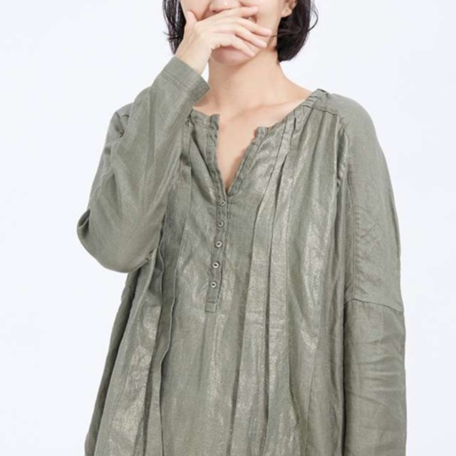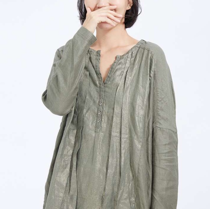 胸元のタックとくるみボタンが上品なアクセントを添える女性向けチュニック。