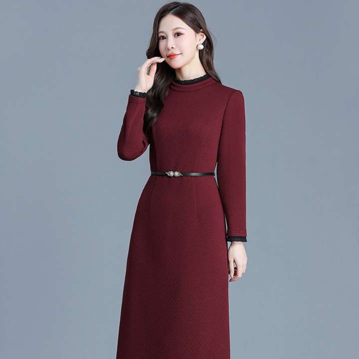 上品なハイネックデザインが魅力のこのワンピースは、細身のシルエットで洗練された印象を与えます。胸元から裾にかけての縦長ラインと、ウエストを引き締める細ベルトが女性らしさを引き立て、スタイルを美しく見せます。長袖のデザインは体型カバーにも優れ、シーンを選ばず活躍する一着です。チュニックとしても着こなせるため、さまざまなスタイルを楽しめます。