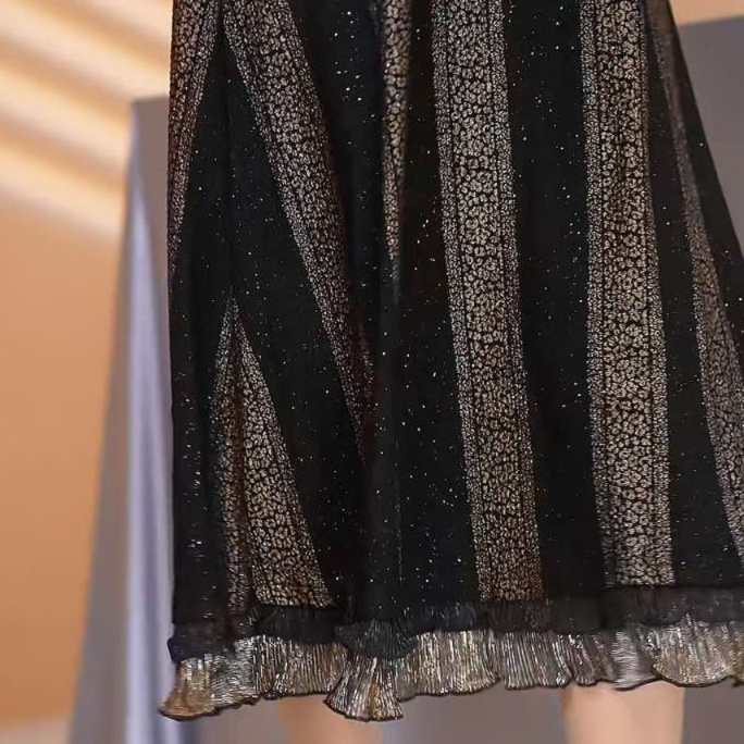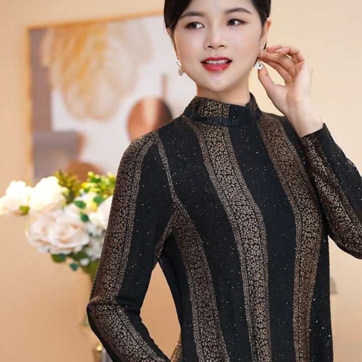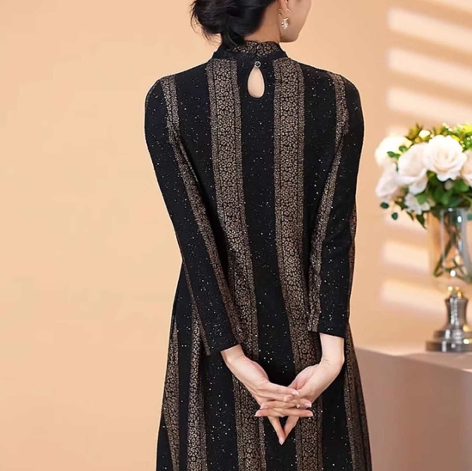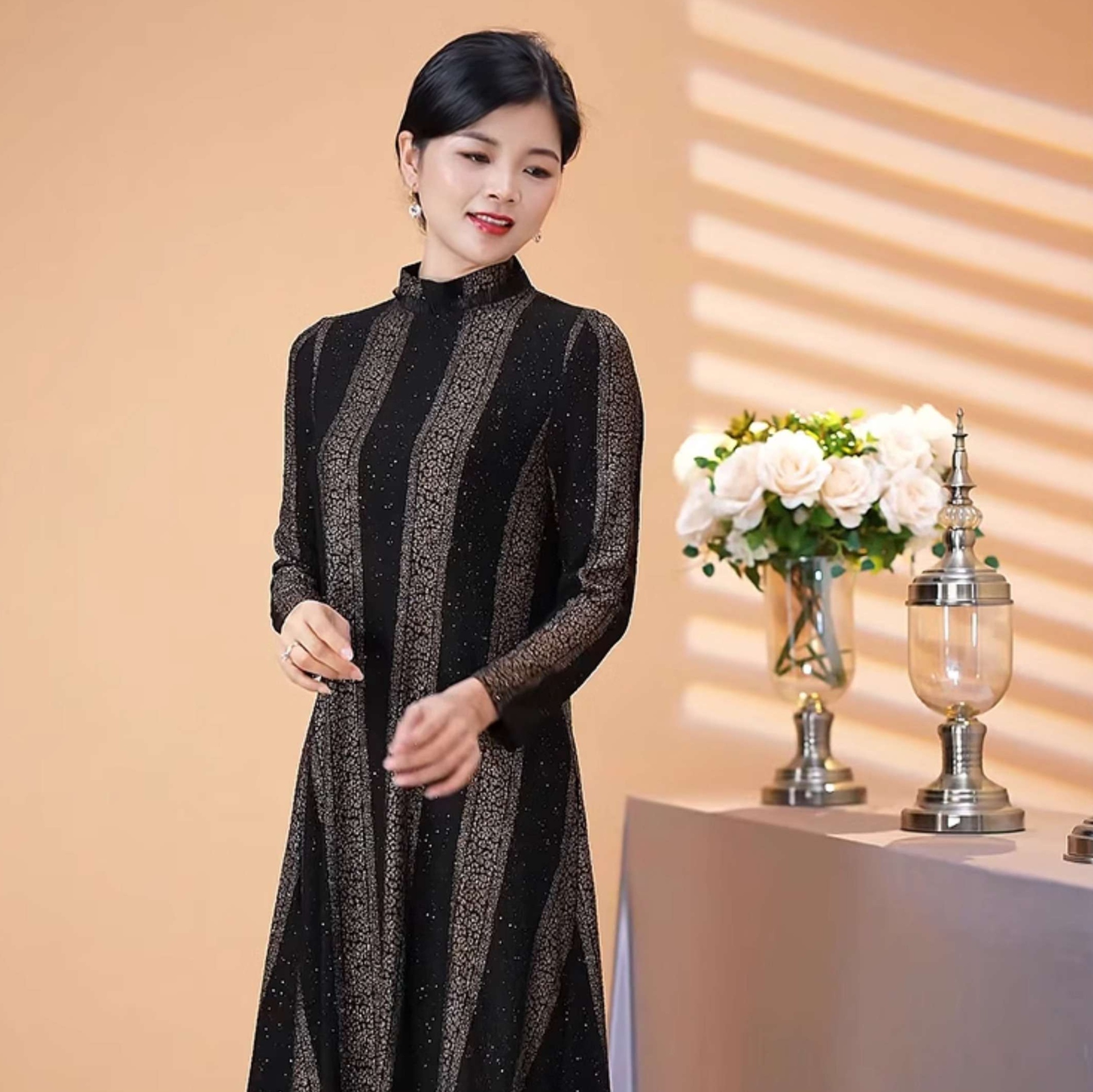 上品な光沢感を持つ生地に、洗練された縦ストライプ模様が施されたチュニックワンピース。スタンドカラーとフレア裾が、エレガントさを引き立てます。特別な日や結婚式など、フォーマルなシーンに最適なアイテムです。大人の女性にふさわしいスタイルを提供し、華やかな印象を与えます。コーディネート次第で、さまざまなシーンに対応可能な一着です。