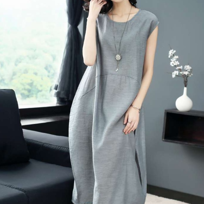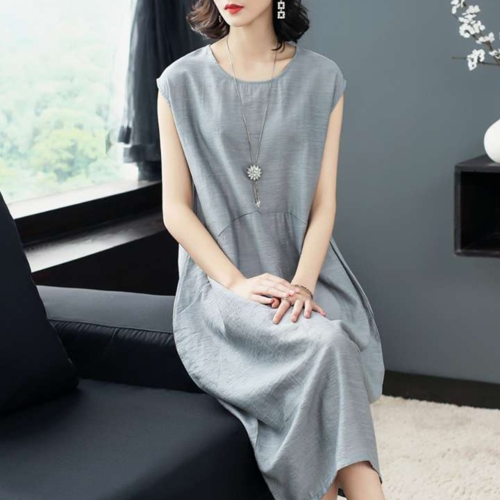 ゆったりとしたシルエットのチュニックワンピースは、しわになりにくい素材を使用し、快適さを追求。袖なしデザインが涼しげな印象を与え、夏のお出かけにぴったり。胸元のネックレスが上品なアクセントとなり、長めの丈感で体型カバー効果も兼ね備えています。カジュアルからフォーマルまで幅広く活躍する一着です。