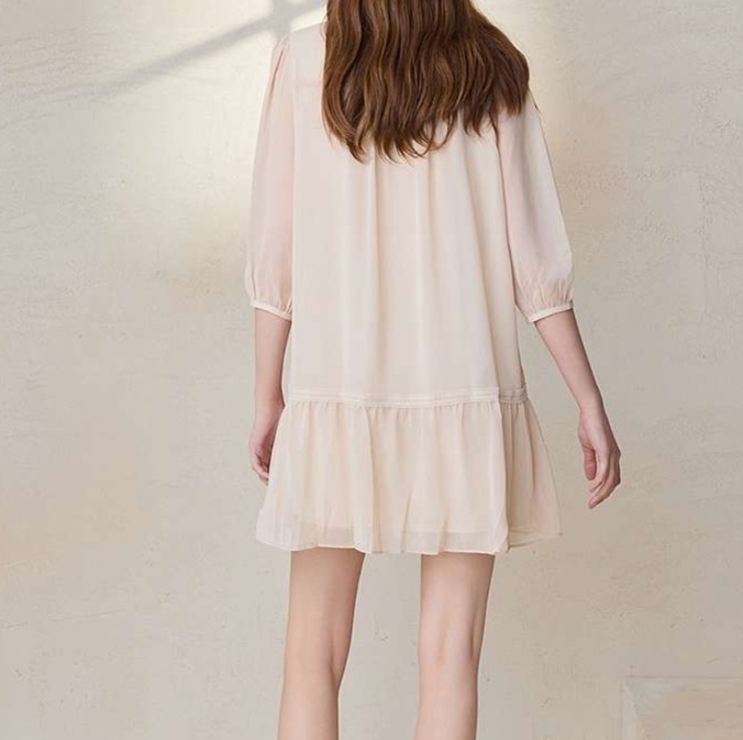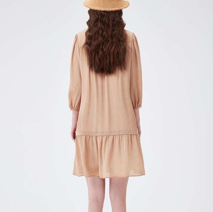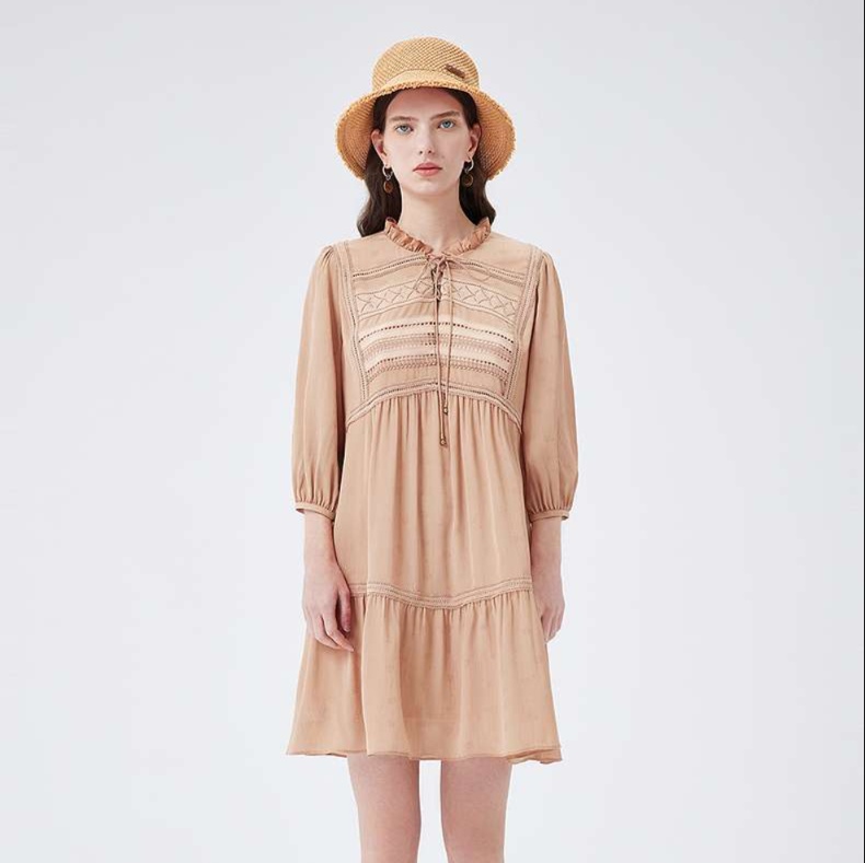 春夏にぴったりのチュニックワンピース。華やかな刺繍とリボンデザインが胸元を彩り、七分袖とティアードシルエットで軽やかな印象を与えます。カジュアルながらも上品な雰囲気を醸し出し、さまざまなシーンで活躍する一着。快適な着心地を楽しみながら、スタイリッシュに決まるアイテムです。