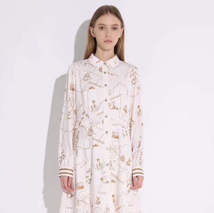 冒険をテーマにしたコンパスや馬車、テントの線画プリントが印象的なチュニックワンピース。襟付きのシャープなシルエットが魅力を引き立て、裾のふんわりとしたフリルが大人可愛い雰囲気を演出します。カジュアルな日常使いから特別な日まで幅広く活躍する一着です。シンプルなデザインに遊び心をプラスした、このチュニックワンピースで新しいスタイルを楽しんでください。