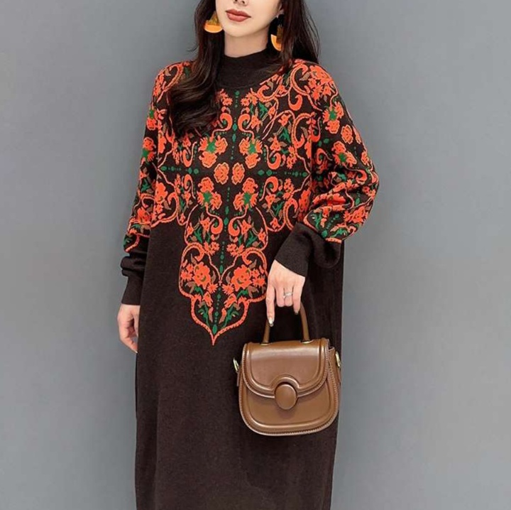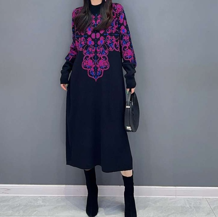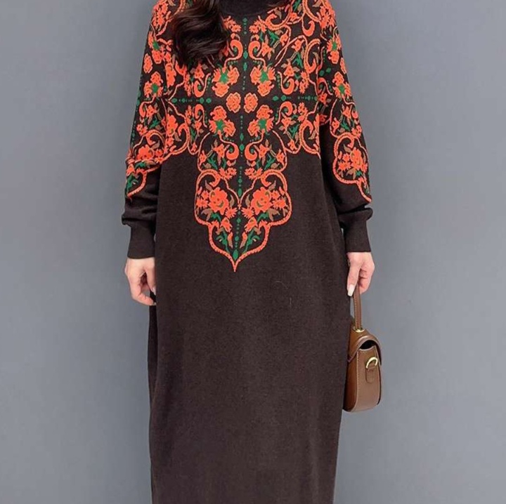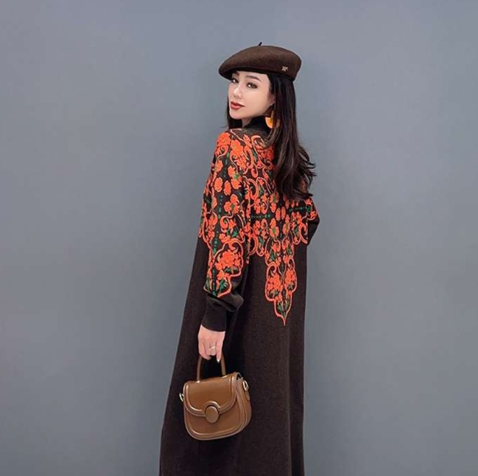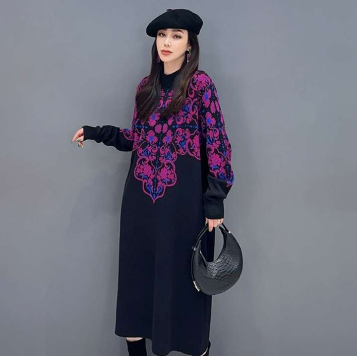 ゆったりとしたシルエットが魅力的なチュニック風ワンピース。 背面に広がる華やかな花柄刺繍が印象的な長丈デザイン。 ハイネックの襟元と袖口のリブ編みがアクセントとなり、上品な装いを演出する一枚。 日常使いからお出かけまで幅広く活躍するワンピースです。