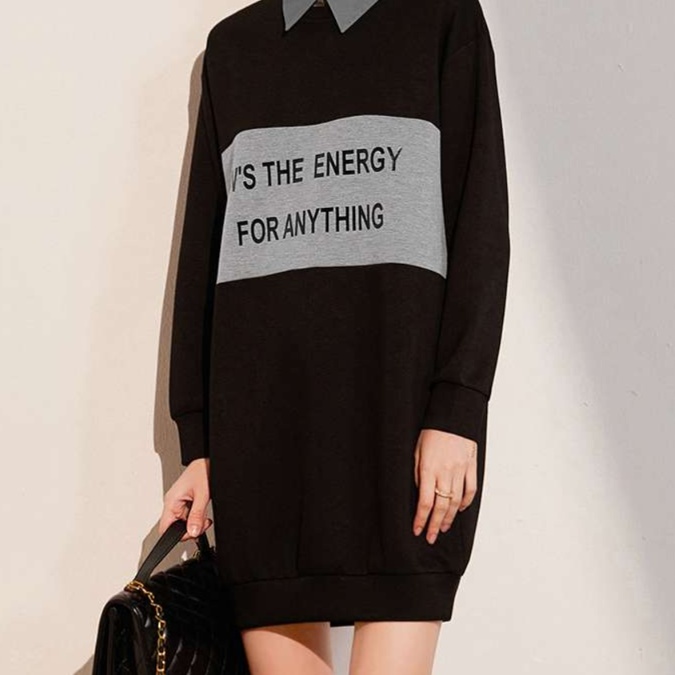 リラックス感のあるシルエットが魅力のスウェット素材チュニックワンピース。グレーの衿と目を引くメッセージプリントがアクセントとなり、カジュアルながら洗練された印象を与えます。短めの丈が足元をすっきりと見せ、どんなスタイルにも合わせやすい一着です。デイリーコーデにぴったりのアイテムとして、さまざまなシーンで活躍します。