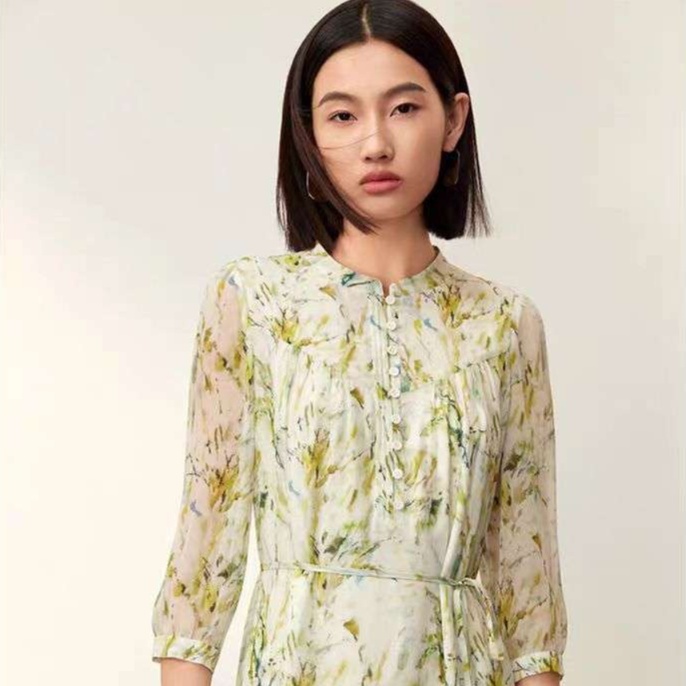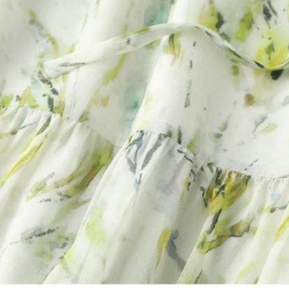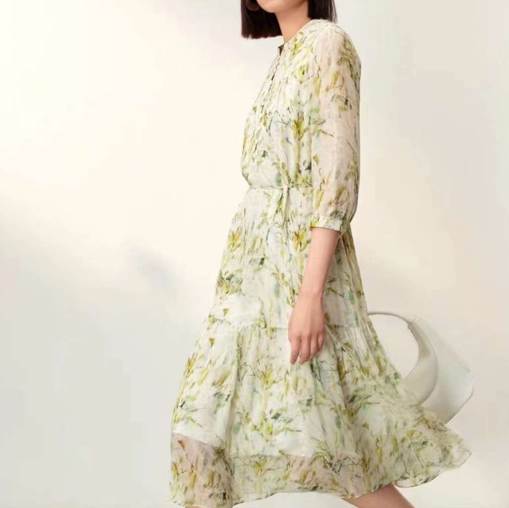 シフォン素材のふんわり七分袖チュニックワンピース、繊細な草花模様が優雅さを引き立てます。ウエストマークと裾のフレアシルエットにより、女性らしい柔らかな印象を与え、軽やかな着心地が春夏のお出かけに最適です。これ一枚で、シンプルながらも洗練されたスタイルを実現します。