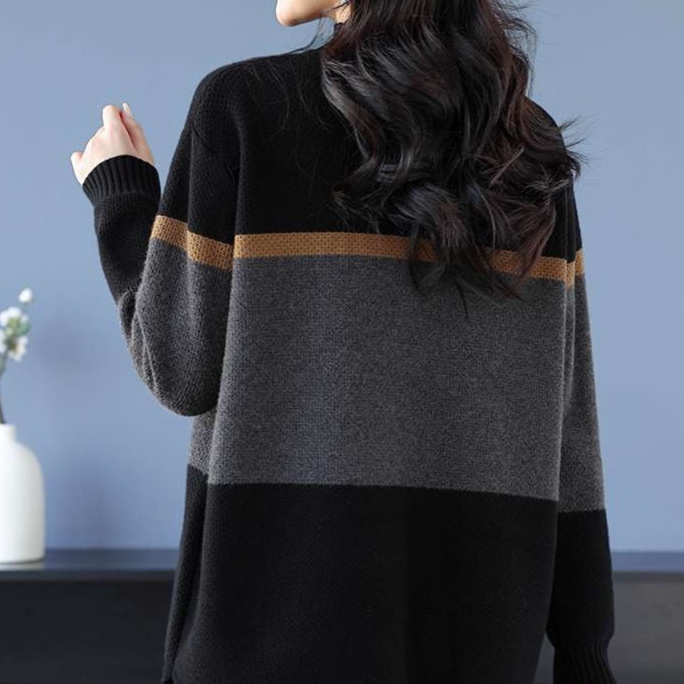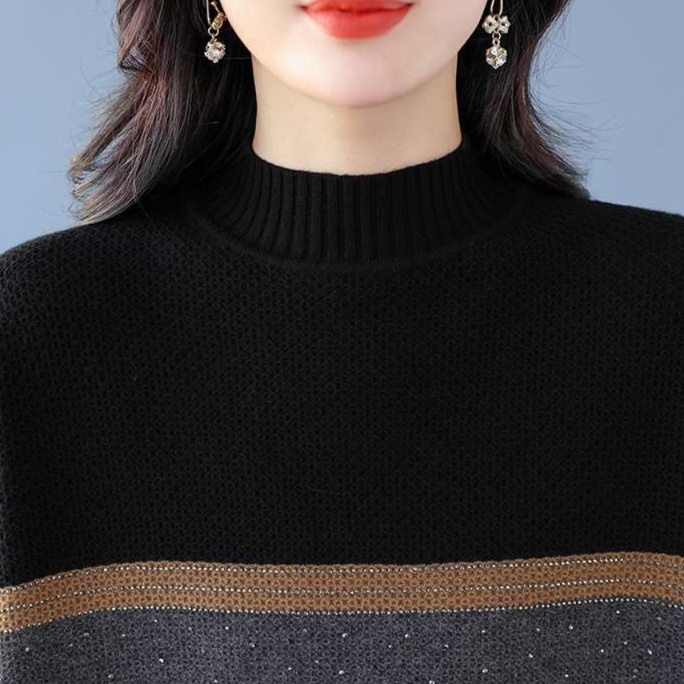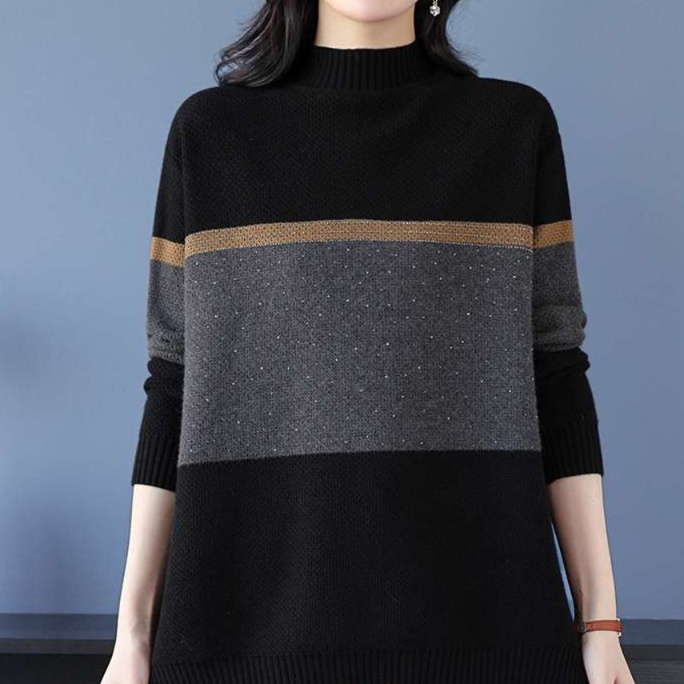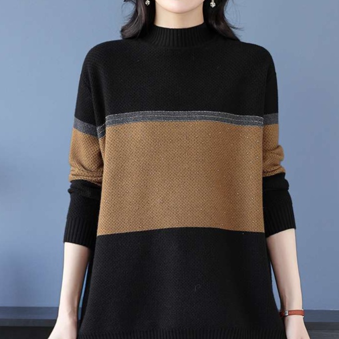 上品な印象を与えるハイネックデザインのニットチュニック。特徴的なパネル切替が施され、ゆったりとしたシルエットでリラックス感を演出します。中央のキラキラ装飾が華やかさを加え、柔らかな素材で快適な着心地を実現。普段使いはもちろん、ちょっとしたお出かけにもぴったりなアイテムです。スタイルに合わせたコーディネートが楽しめる一着です。
