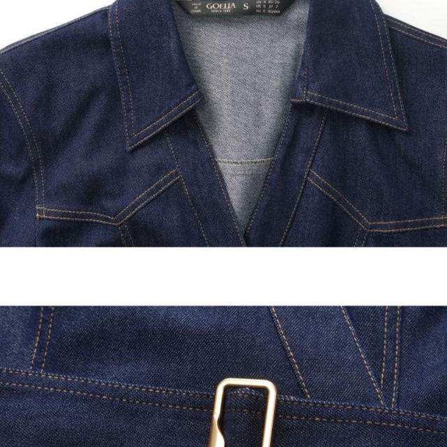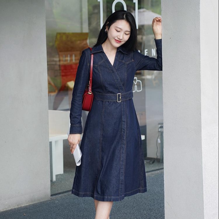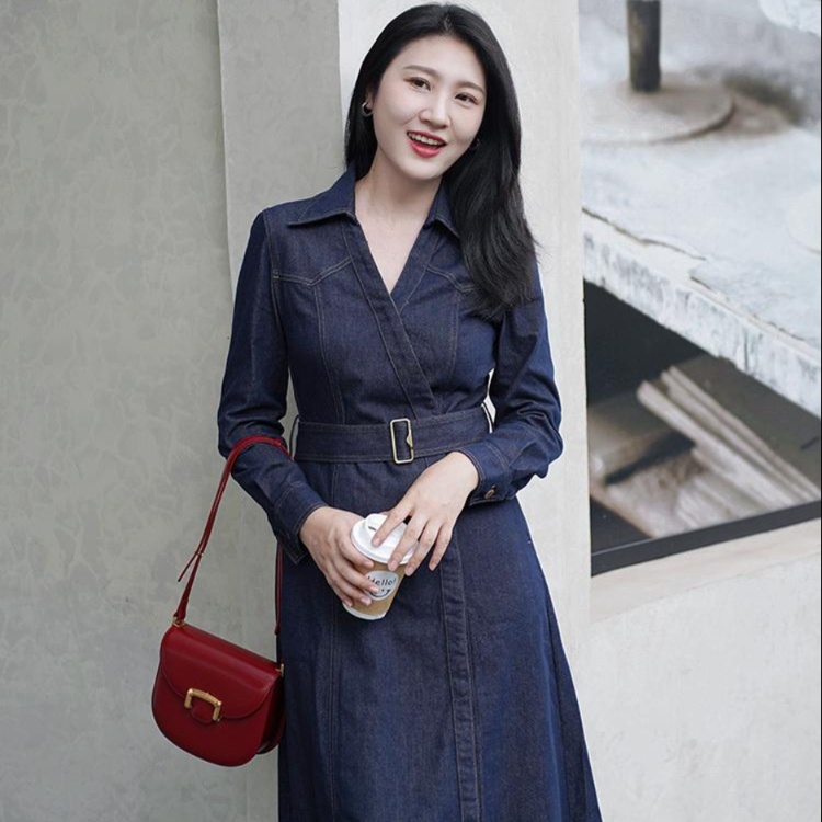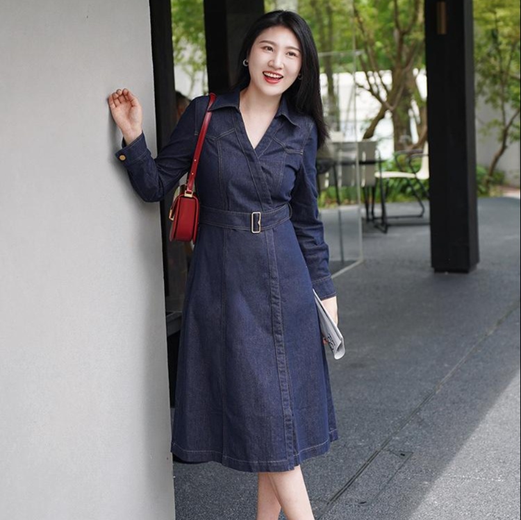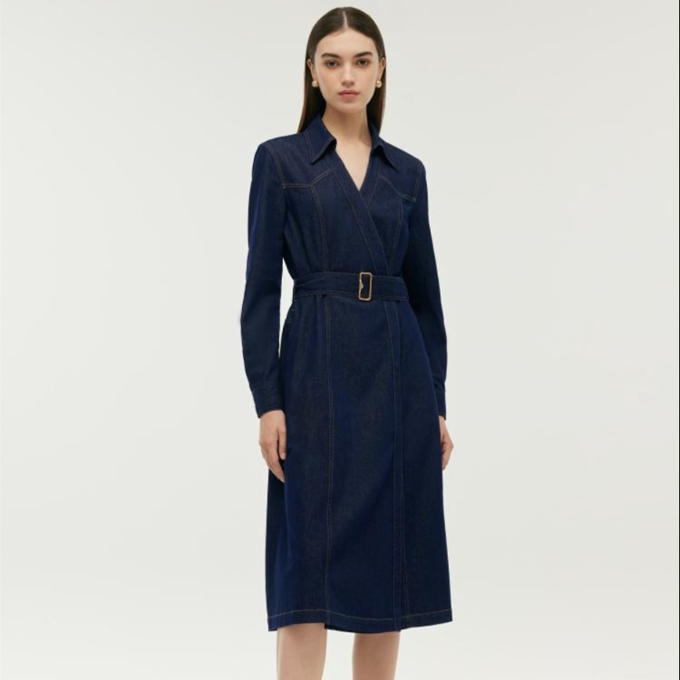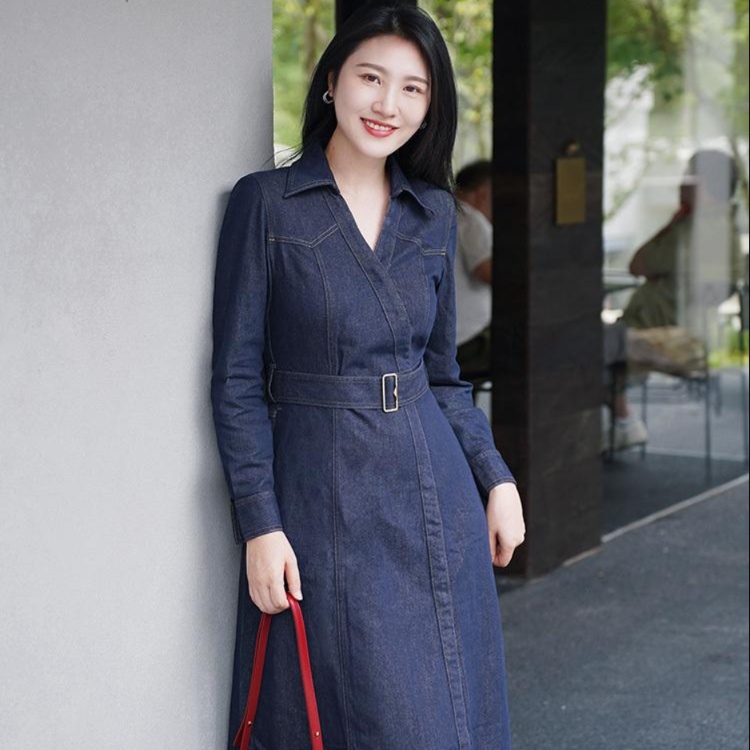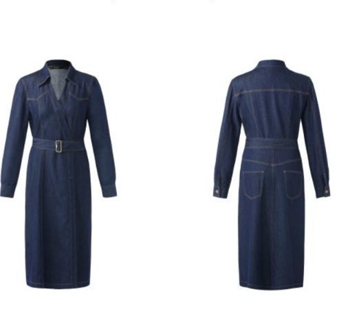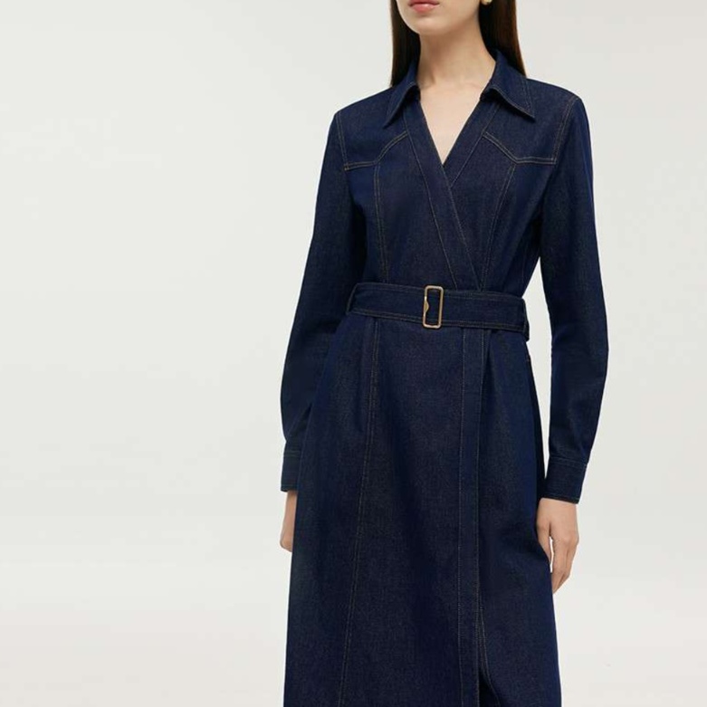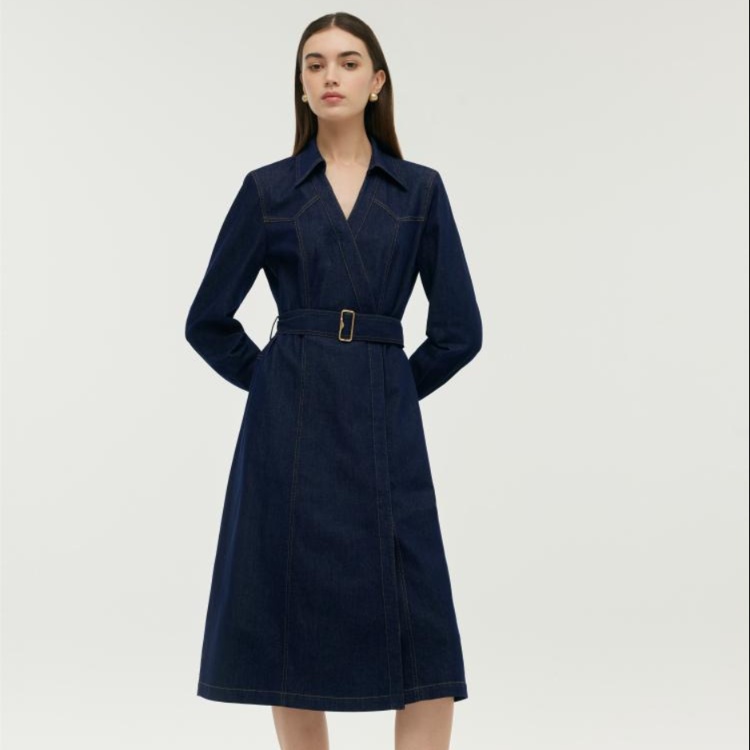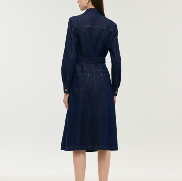 クラシックなデニム素材をドレス仕立てで上品に仕上げた都会的な印象