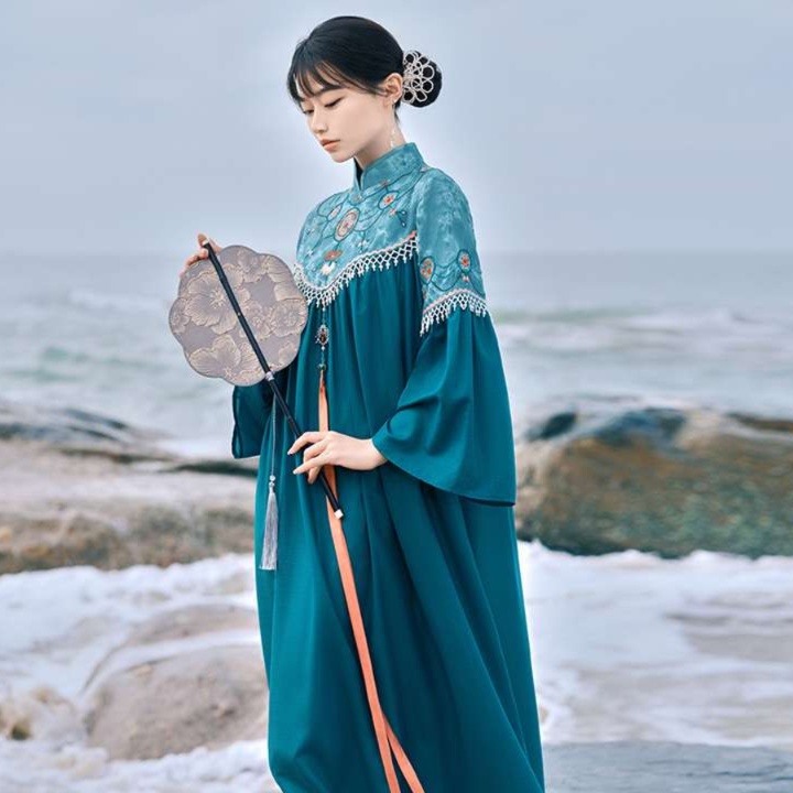 中国伝統様式を取り入れた長丈チュニックワンピースは、上部の繊細な刺繍と裾のフリルが魅力。広がる袖と立ち襟のデザインが、優雅さを引き立てます。海辺の風景とも調和し、特別なシーンを演出する一着。シンプルながら存在感のあるスタイルで、どんなコーディネートにもマッチします。