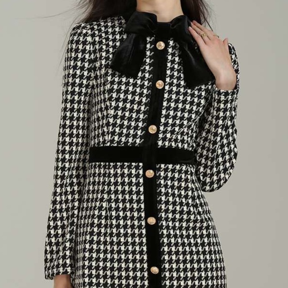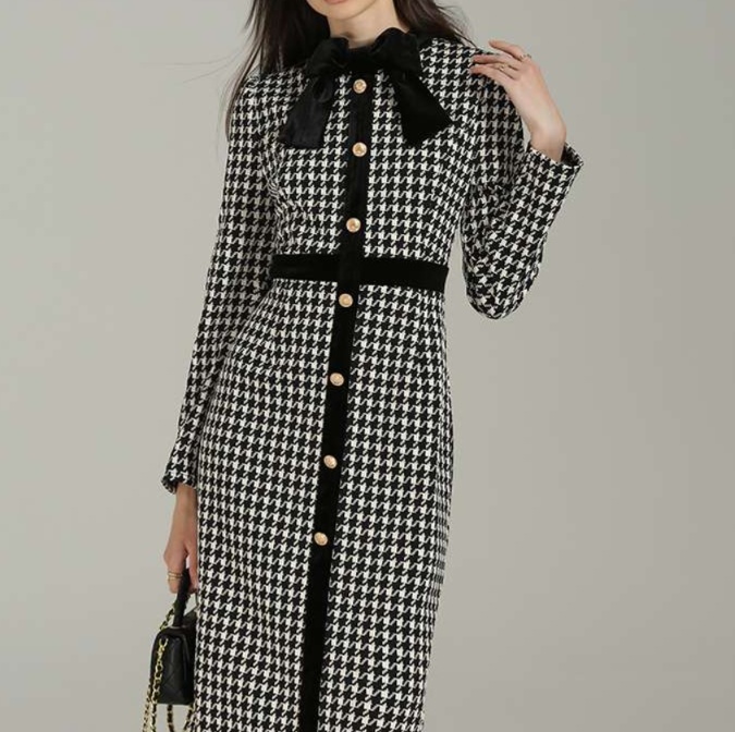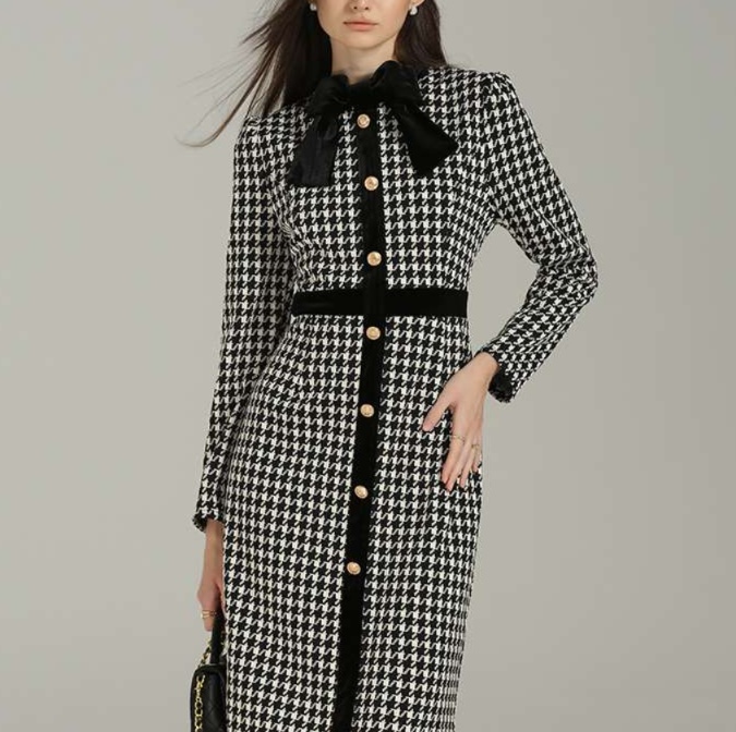 エレガントな千鳥格子柄が魅力のロングチュニックワンピース。柔らかなベロア調のリボンと前開きボタンが、スタイリングに華やかさをプラスします。ウエストラインを美しく引き立てるシルエットは、上品さときちんと感を兼ね備えた大人の女性にぴったり。カジュアルからフォーマルまで幅広く活躍する一着です。