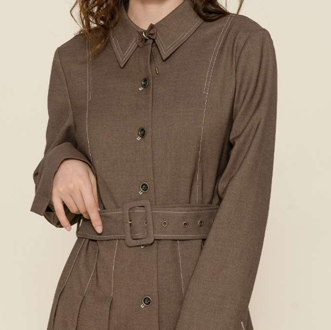 優雅な襟付きデザインのミモレ丈ワンピースは、ウエストベルトで女性らしいラインを引き立てます。プリーツが施されたこのチュニックスタイルは、エレガントさを演出し、オフィスシーンからカジュアルなお出かけまで幅広く活躍。着るだけで自信を与えてくれる一着です。