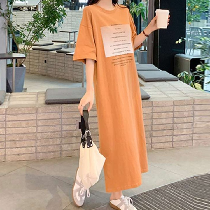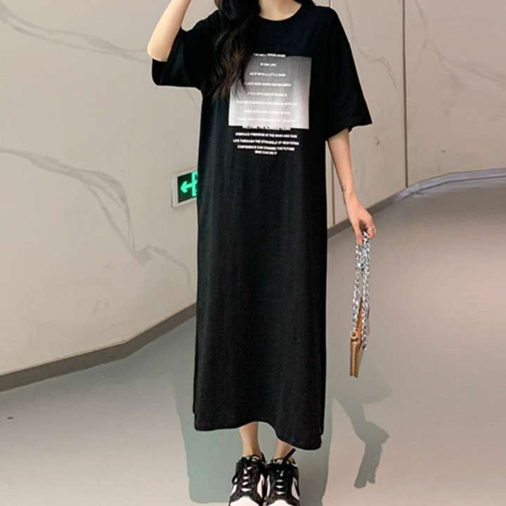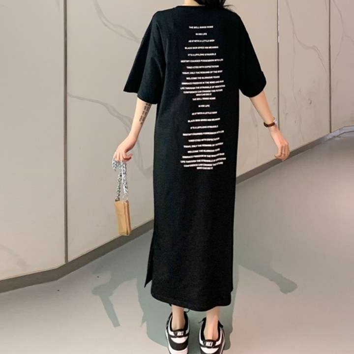 前後異なるレタープリントが魅力的なマキシ丈ワンピース。