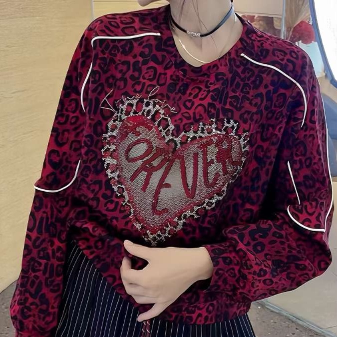 上品なヒョウ柄プリントが目を引き、キラキラ輝くスパンコール装飾のハートモチーフが華やかさを演出。