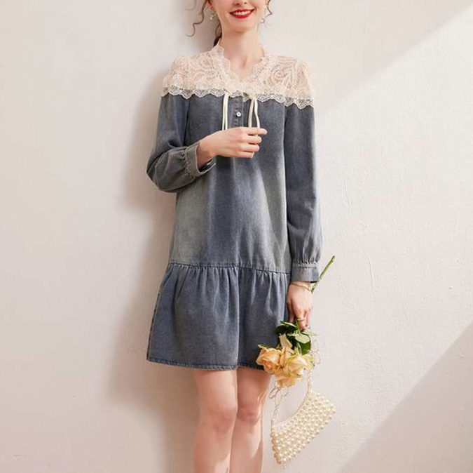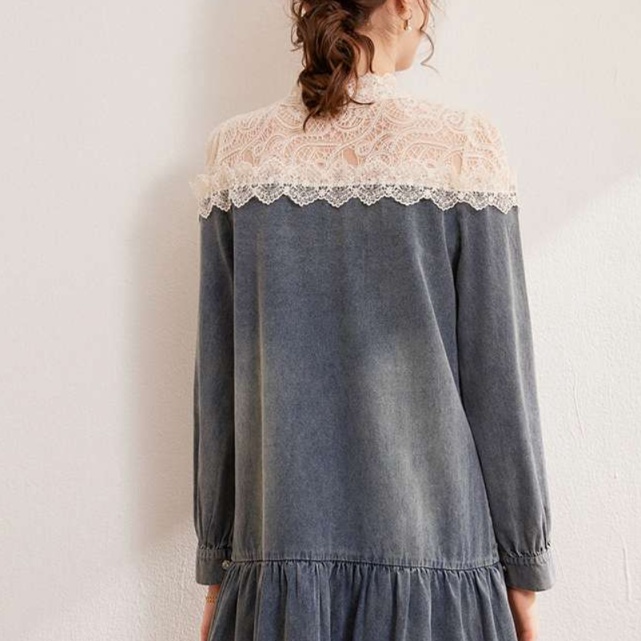 異素材のレースと生地を巧みに切り替えたチュニックワンピース。胸元のリボンと裾のギャザーフリルがアクセントとなり、女性らしさを引き立てるデザイン。長袖なので、肌寒い季節にもぴったり。カジュアルにもフォーマルにも合わせやすく、さまざまなシーンで活躍する一着。自分だけのスタイルを楽しむための必須アイテムです。