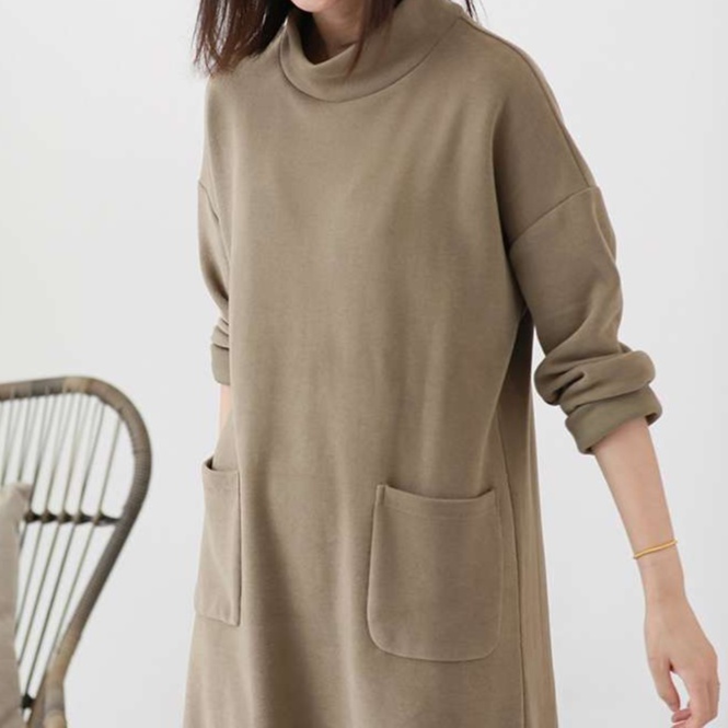 ふんわり柔らかな生地が心地よい、リラックス感あふれるチュニックスタイルのワンピース。大きめのポケット付きで、実用性も兼ね備えています。すっきりとしたタートルネックデザインは、カジュアルな部屋着としても外出着としてもぴったり。長めの丈が体型を気にせず、安心して着こなせる一枚です。さまざまなシーンで活躍する、スタイリッシュなアイテムとしておすすめです。