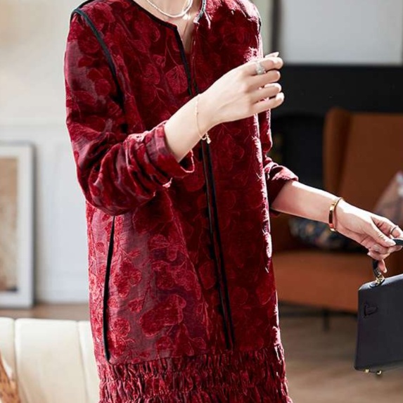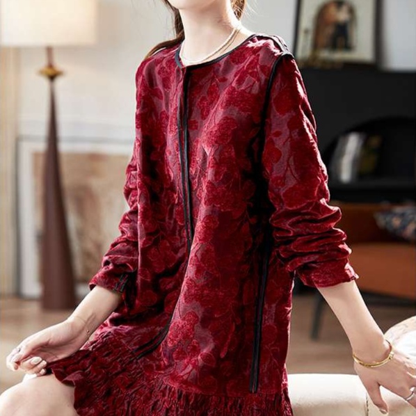 ラグジュアリーな光沢感を持つベロア素材を採用したチュニックワンピース。優雅な花柄が施され、フリルの裾がフェミニンな魅力を引き立てるデザイン。長めの袖が季節の変わり目にぴったりで、上品な印象を与えます。特別な日のお出かけやカジュアルなシーンでも活躍する一着です。自信を持って着こなせる、女性らしさを引き立てるアイテム。