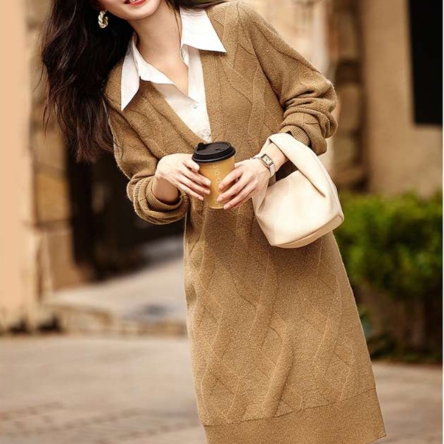 洗練されたニットチュニックは、首元の白いシャツ襟が魅力的なアクセント。立体的な菱形模様が施された上質なセーター素材を使用し、ゆったりとしたシルエットで体型をしっかりカバー。程よい丈感が大人の上品さを引き立て、ワンピースとしても活躍する万能アイテム。カジュアルからフォーマルまで幅広くコーディネートできる一枚。