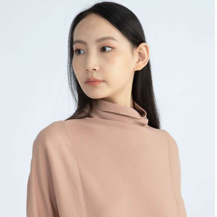 控えめな立ち襟が首元をすっきりと見せ、知的で上品な印象を演出