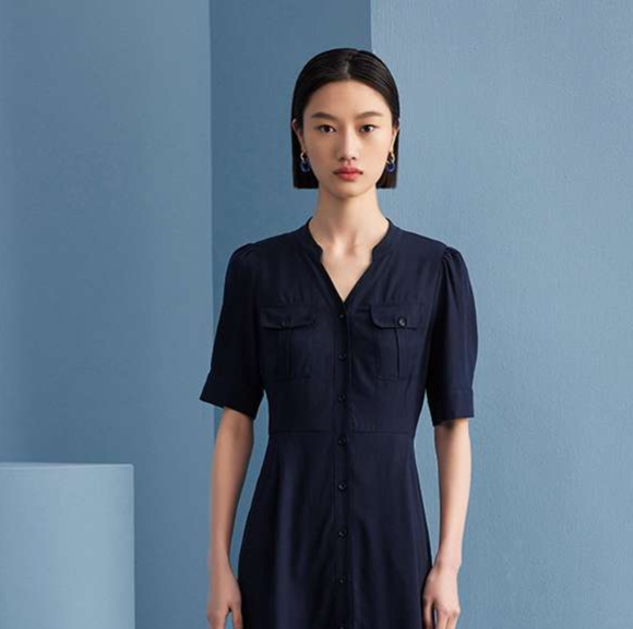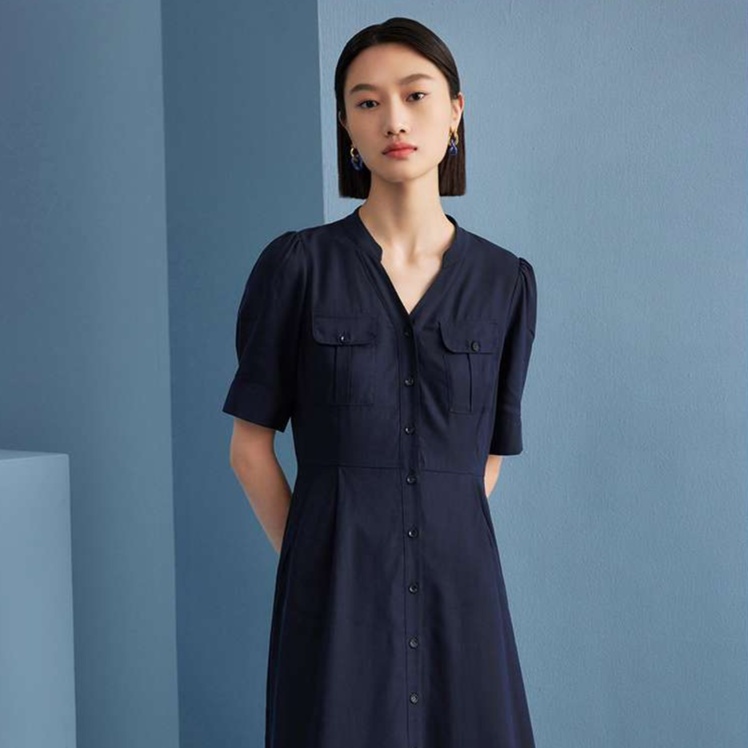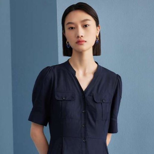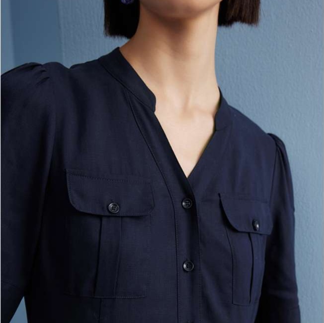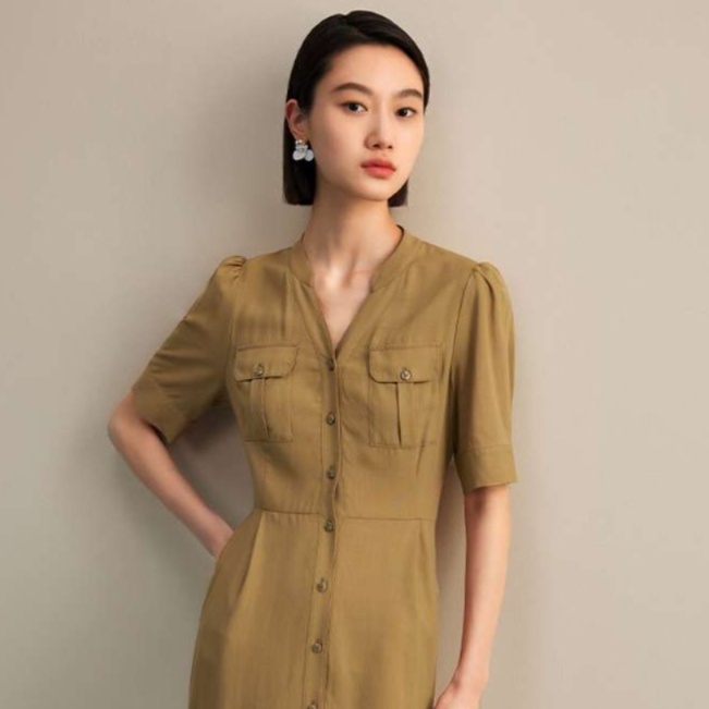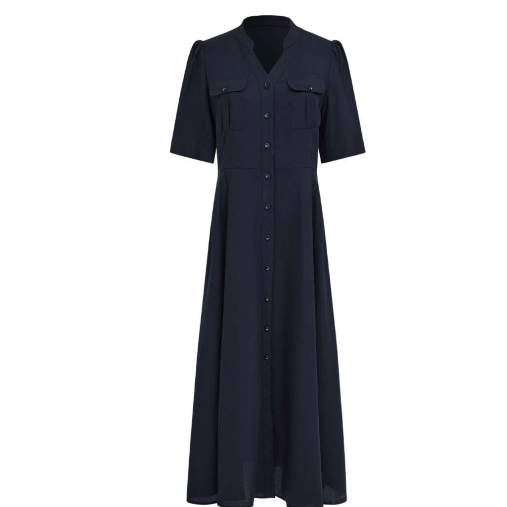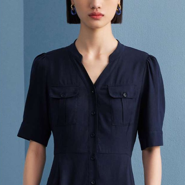 前開きデザインのミリタリーテイストチュニックワンピース。胸ポケットや半袖のパフスリーブがスタイルに遊び心をプラス。すっきりとしたシルエットで上品さを引き立て、ウエストのシェイプが美しいラインを形成。カジュアルにもフォーマルにも着こなせる一着、さまざまなシーンにフィットします。