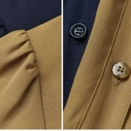 Vネックの襟元がすっきりとした印象で、デコルテラインを美しく見せる効果的なデザイン