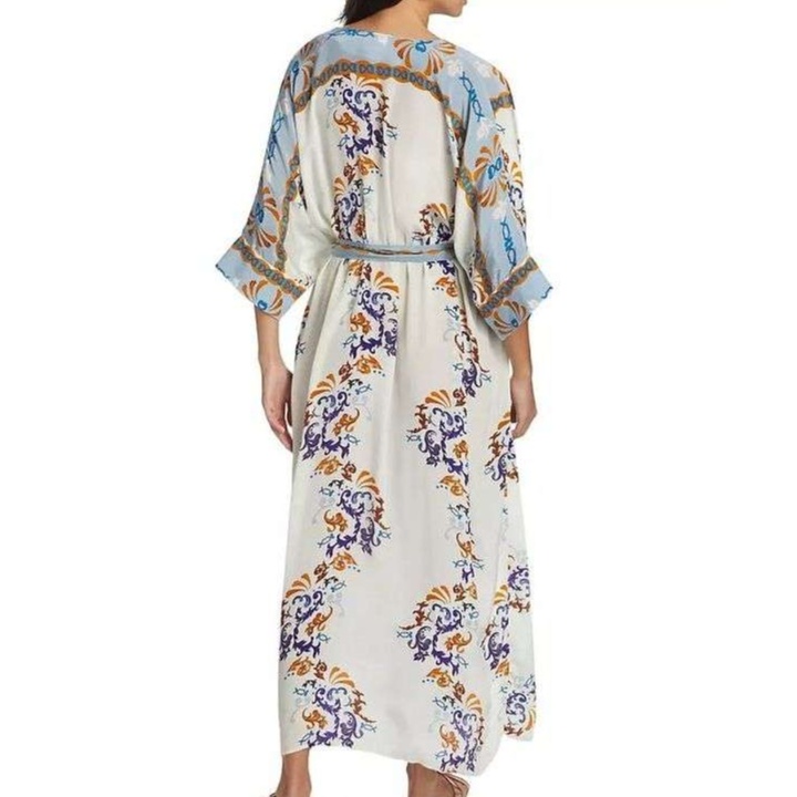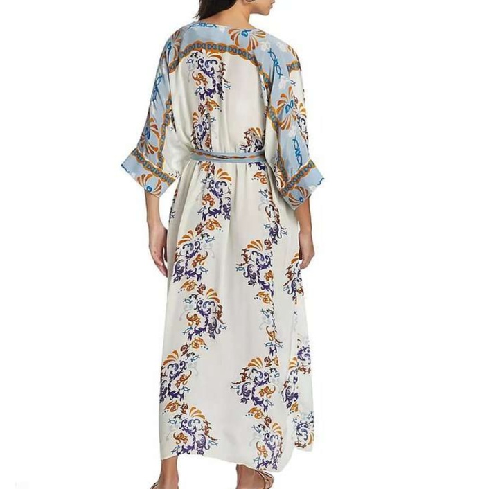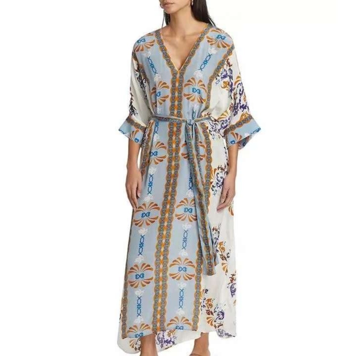 軽やかな素材と優雅なシルエットが魅力のマキシ丈チュニックワンピース。深めのVネックや七分袖が特徴で、ウエストのリボンが体型を美しく引き立てる。リゾート感満載のデザインで、フラットサンダルとのコーディネートが楽しめる。お出かけやリラックスタイムにぴったりな一着。