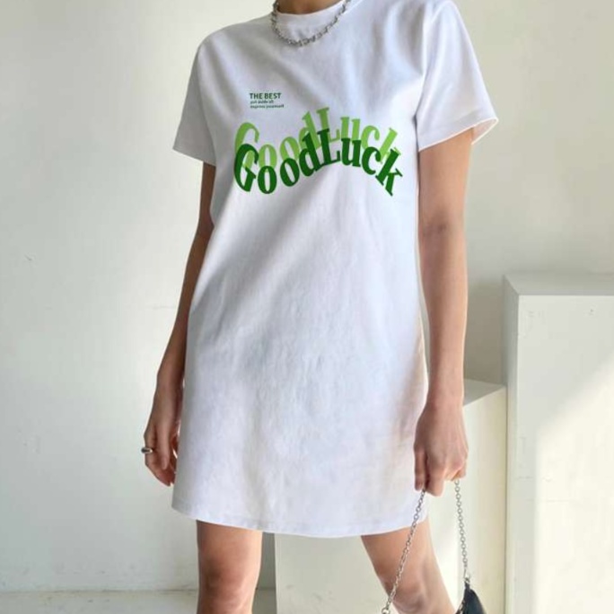リラックス感あふれるシルエットのチュニックワンピース。正面には目を引くポップなメッセージプリントが施され、カジュアルながらも個性的な印象を与えます。デイリーユースにぴったりで、さまざまなスタイルに合わせやすい一枚です。お出かけやリラックスタイムに最適なアイテムとして、コーディネートを楽しむことができます。