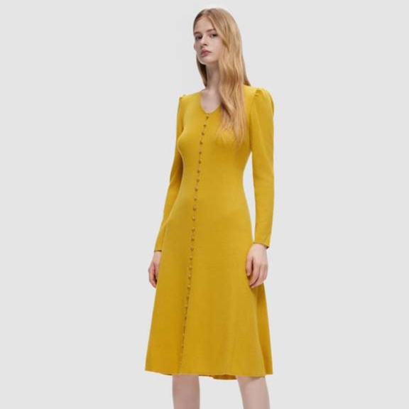 すっきりとした長袖のシルエットと、控えめな肩パフがレトロで上品な雰囲気を演出